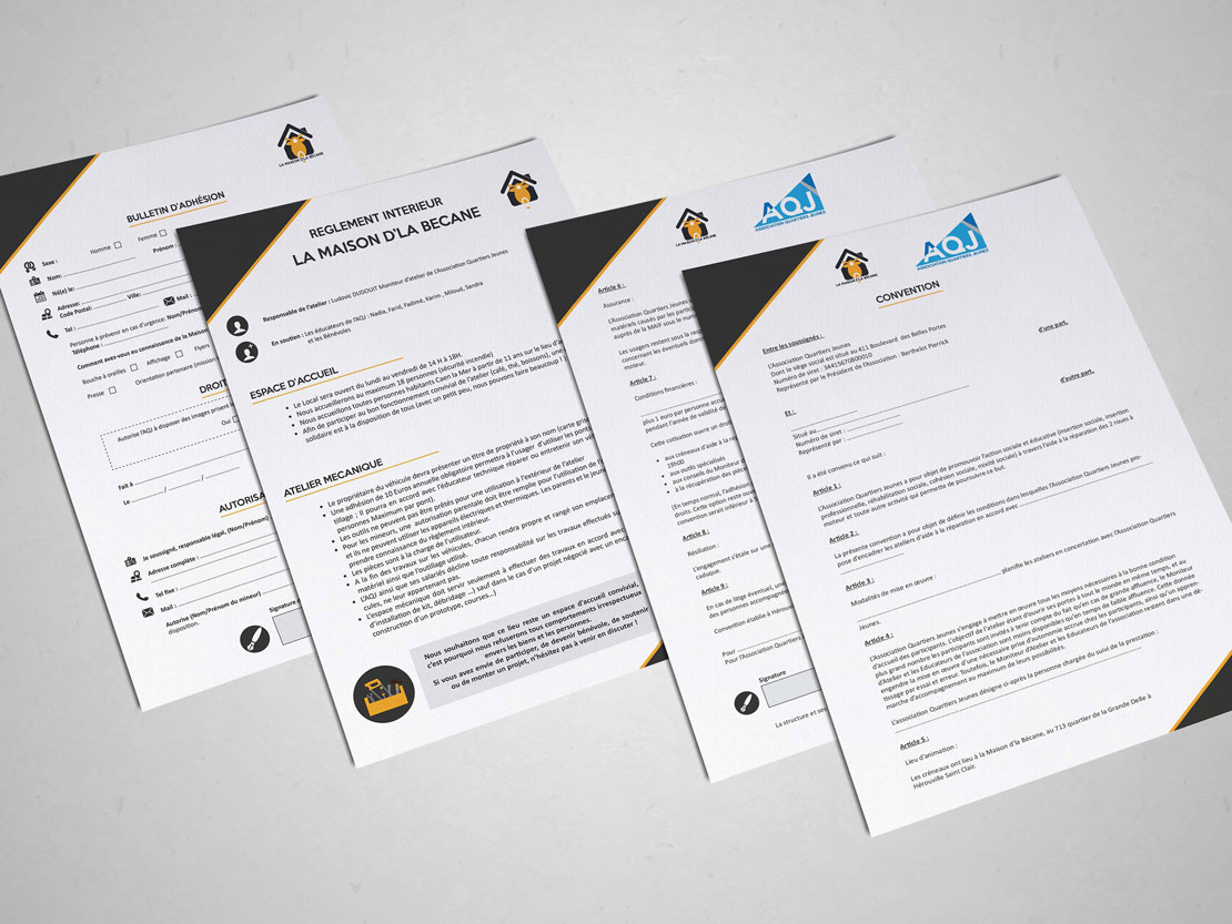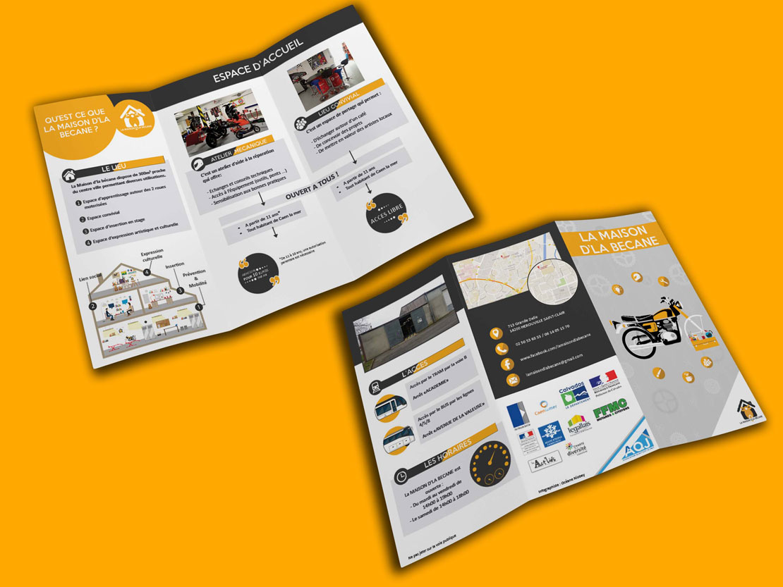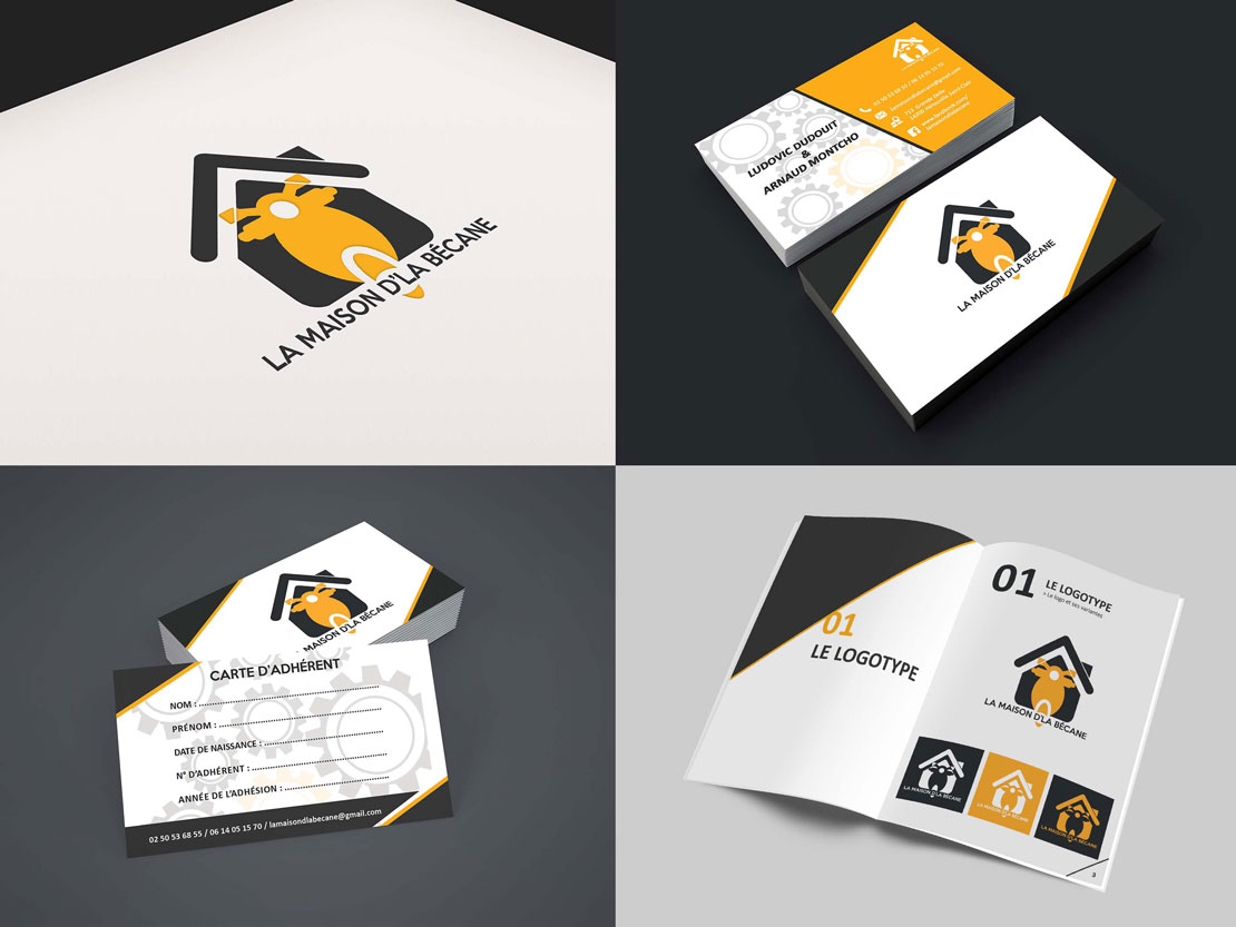 Réalisation de toute l'identité visuelle de la Maison D'La Bécane (atelier mécanique 2 roues situé à Hérouville Saint-Clair) : création logo, charte graphique, carte de visite, carte d'adhérent, documents format A4 et A3 (réglement intérieur, fiche d'inscription, feuille de convention), dépliant 3 volets et réalisation d'un tampon.